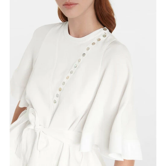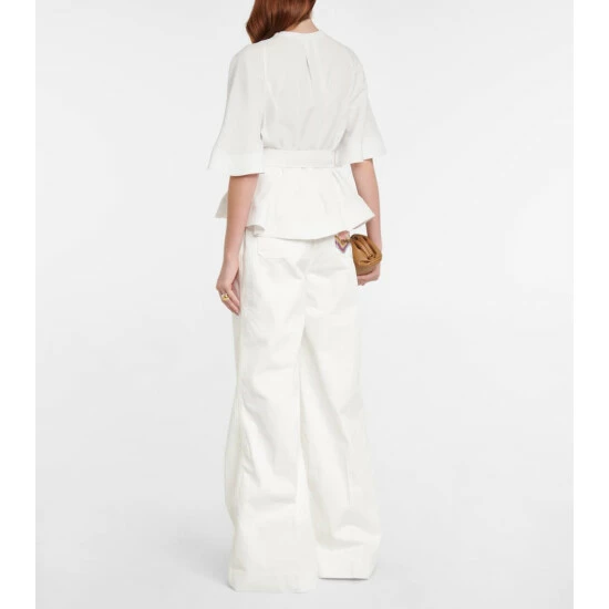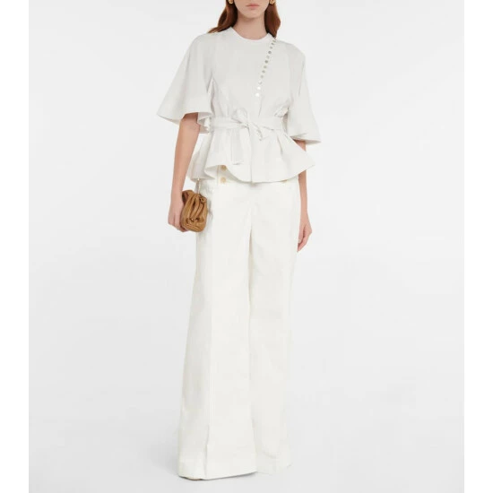 Altuzarra’s crêpe Ash top has flared short sleeves and a peplum hem. It’s belted at the waist and features mother-of-pearl buttons that fasten diagonally across the bodice.