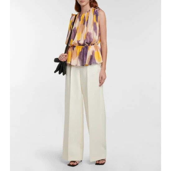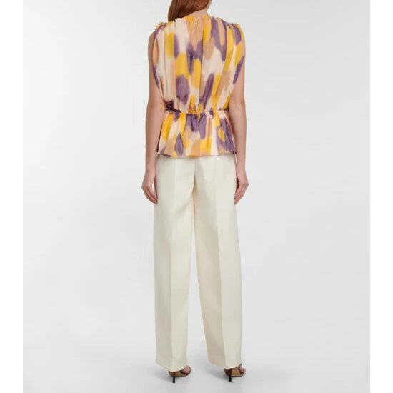 Altuzarra’s Baldur top features a high neckline and a cinched waist for a softly pleated effect. The sleeveless design has a colorful tie-dye print and a peplum hem.