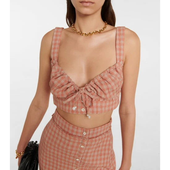 Usher in summer romance with the Bijou cropped top from Altuzarra. Featuring a muted orange gingham pattern, the style has a sweetheart neckline, wide straps, and a front self-tie.