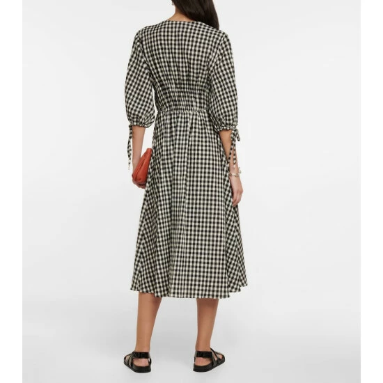 Altuzarra’s Donrine dress has drawstring ties that create a shirred effect through the bodice. It’s made from a structured gingham cotton-blend with a V-neckline, flared skirt and pearl-like bead trims.