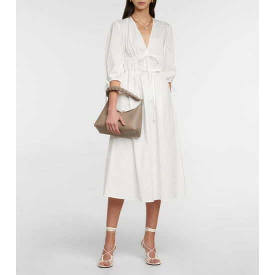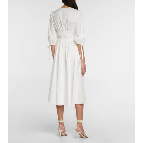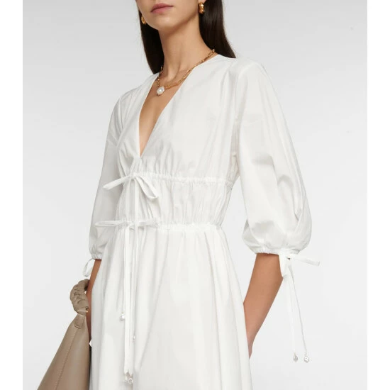 Altuzarra’s Donrine dress has drawstring ties that create a shirred effect through the bodice. It’s made from a structured cotton-blend with a V-neckline, flared skirt and pearl-like bead trims.