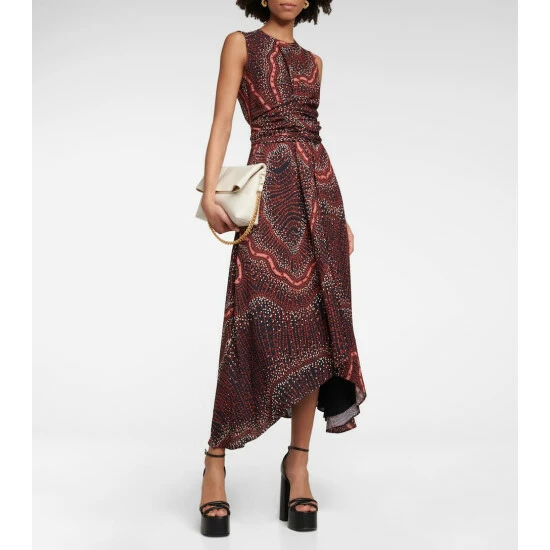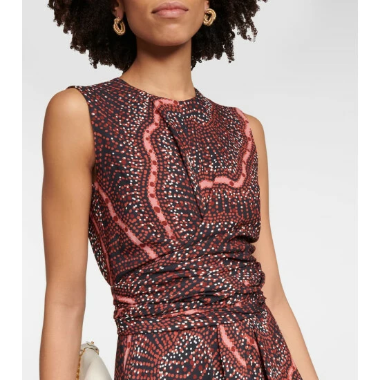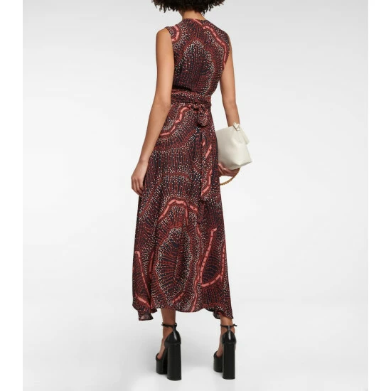 Altuzarra’s Penny dress has a sleeveless bodice with a crew neckline. It is defined by its printed design, elegant wrap waist, and skirt that falls to a midi-length with an asymmetrical hem.