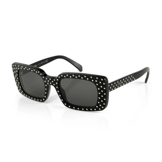 These rectangular sunglasses from Celine Eyewear are embellished with crystals for a dramatic effect. The pair is made from glossy black acetate with tonal lenses. Please note the color of the protective case may vary.